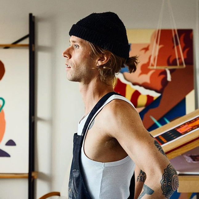 Finn has used many materials to create his art, from skate decks to surfboards, recycled car doors, walls and traditional canvas, but what remains consistent is his unique point of view. Drawing inspiration from street and skate culture, Finn throws in his own twist, often giving us the unexpected, which is where the magic happens.