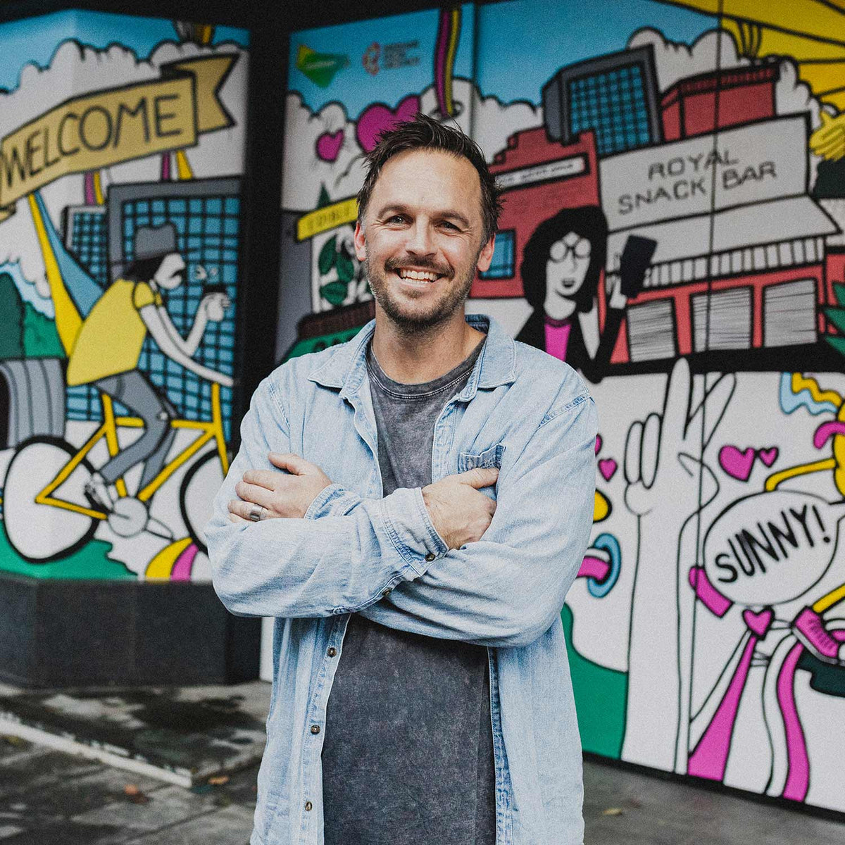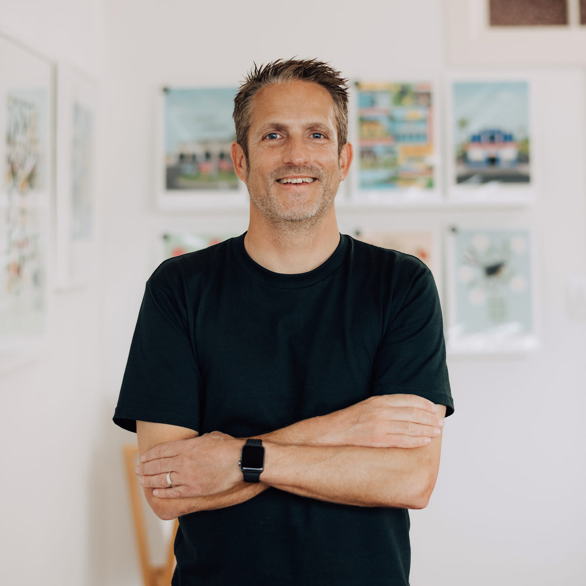 Renowned for his confident and ‘kiwi cool’ aesthetic, Greg’s nostalgic and retro artworks are recognisable by their bright hues, simple geometric shapes and sense of fun. A keen surfer, Greg’s artwork explores all corners of Aotearoa, capturing quintessential moments in time like summer roadies, riding bikes, hitting the waves and hanging out at the beach.